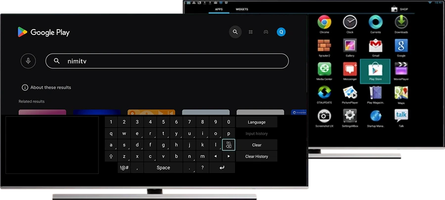 Zgjidhni ikonën Play Store në rubrikën e Aplikacioneve. Mandej përzgjidhni rubrikën “kërko” (search), dhe në të shkruani “NimiTV.” Pasi ta shkruani NimiTV me tastierën elektronike shtypni tastin “Done.”